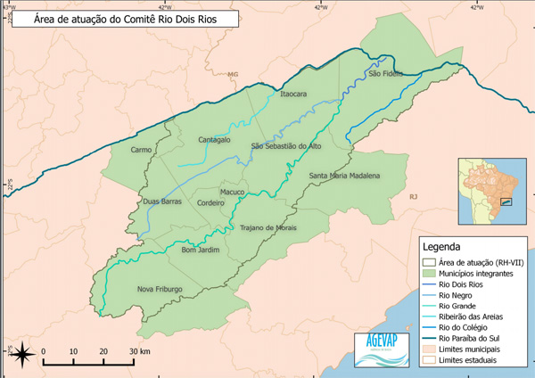 A área de atuação do Comitê Rio Dois Rios corresponde ao território da Região Hidrográfica Rio Dois Rios (RH-Rio Dois Rios ou RH-VII), que se situa ao longo da região central do Estado do Rio de Janeiro até a região norte, e foi definida pela Resolução Nº 107/2013 do Conselho Estadual de Recursos Hídricos do Estado do Rio de Janeiro – CERHI/RJ, que também define as demais regiões hidrográficas do estado.